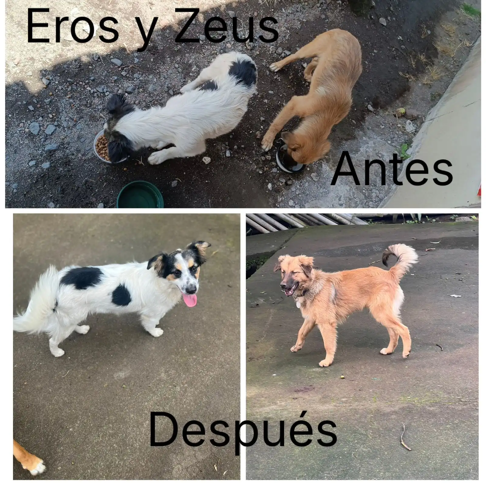 Eros tiene un pelaje distintivo blanco y negro que lo hace destacar. Es un perro sociable, cariñoso y de un tamaño mediano. Está listo para adaptarse a una nueva vida, ya sea junto a su hermano Zeus o en un hogar dedicado solo a él, donde su corazón leal pueda florecer.